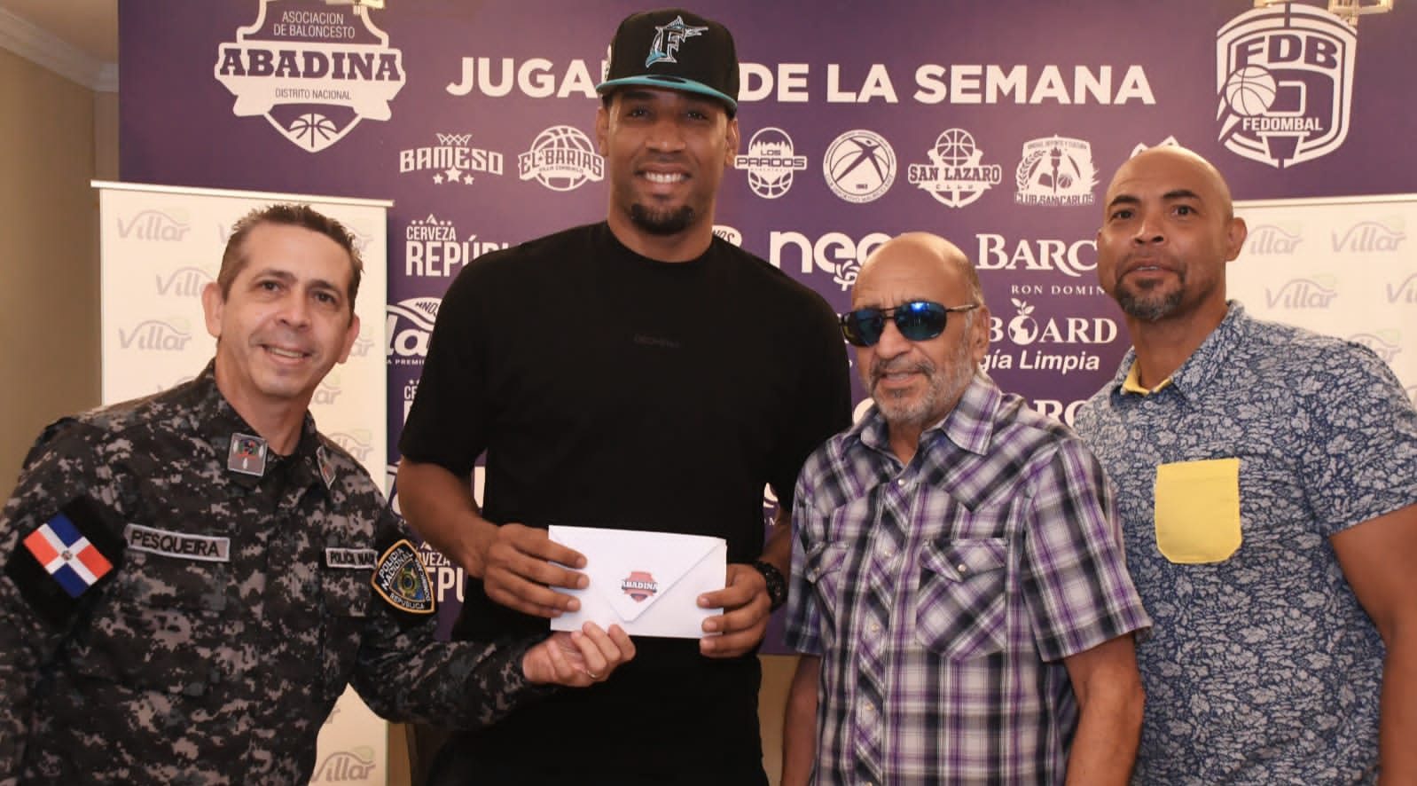 El coronel (PN) Diego Pesqueira, presidente de Abadina, y Fernando Teruel, director general del TBS Distrito 2023 entregaron los premios a Guerrero, quien fue acompañado por el exjugador Jorge Almánzar (La Tata), actual presidente del club San Carlos.
