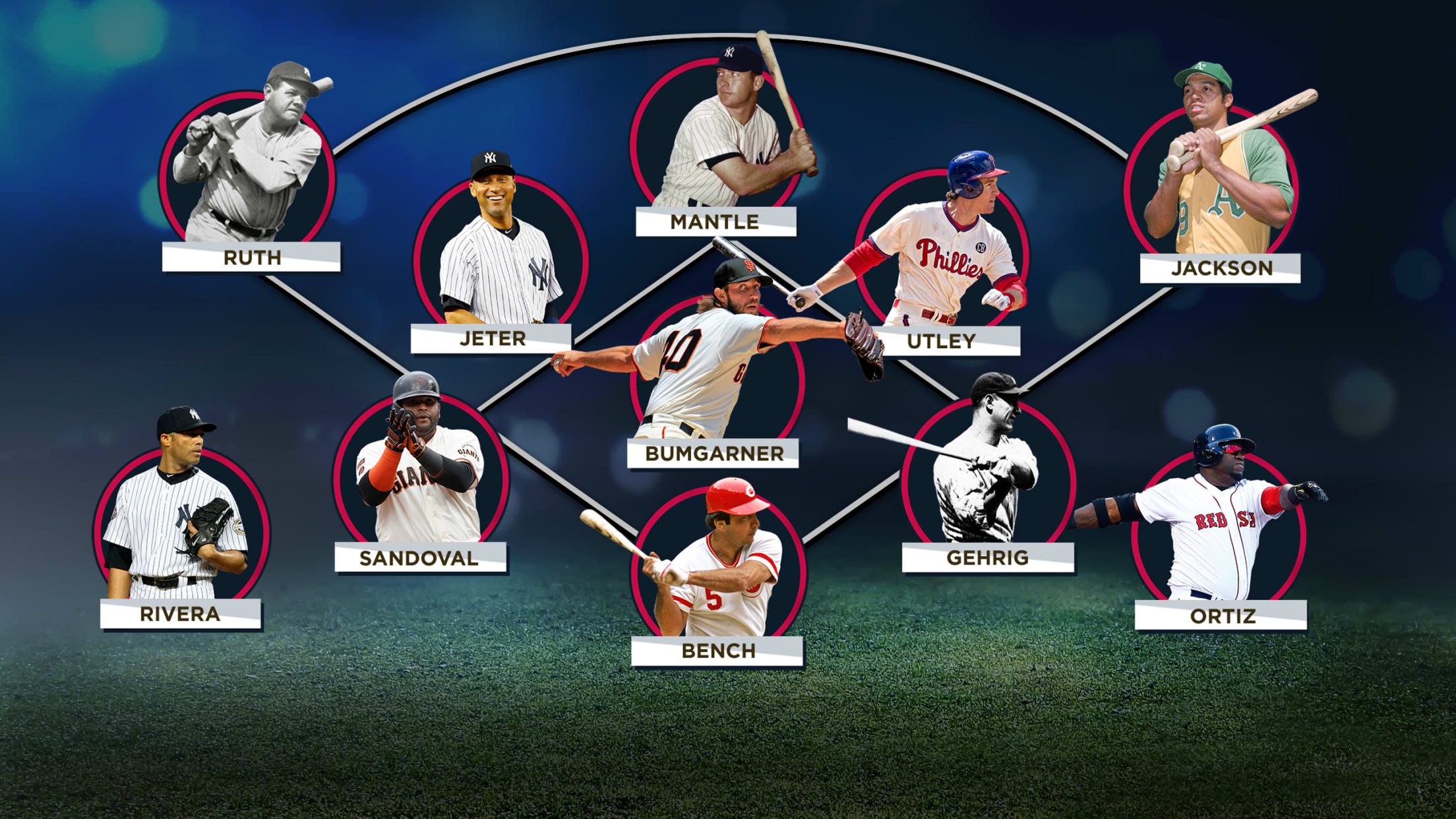Jardines: Babe Ruth, Yankees; Mickey Mantle, Yankees; Reggie Jackson, Atléticos/Yankees