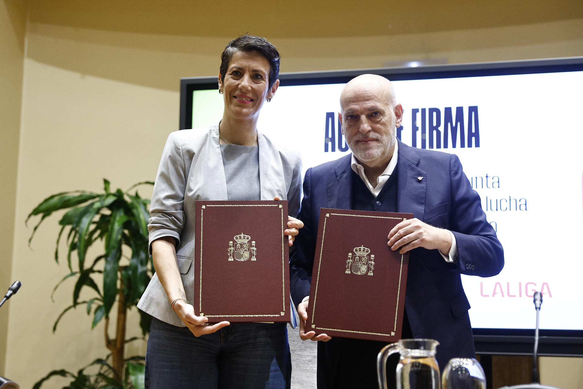 La titular de Seguridad Social, Elma Saiz, y el presidente de LaLiga, Javier Tebas, rubricaron esta alianza, que calificaron de «histórica», en un acto celebrado en la sede del ministerio, en el que unieron sus voces para hacer que en el deporte y, en particular, en el fútbol, haya tolerancia cero hacia los racistas y homófobos.