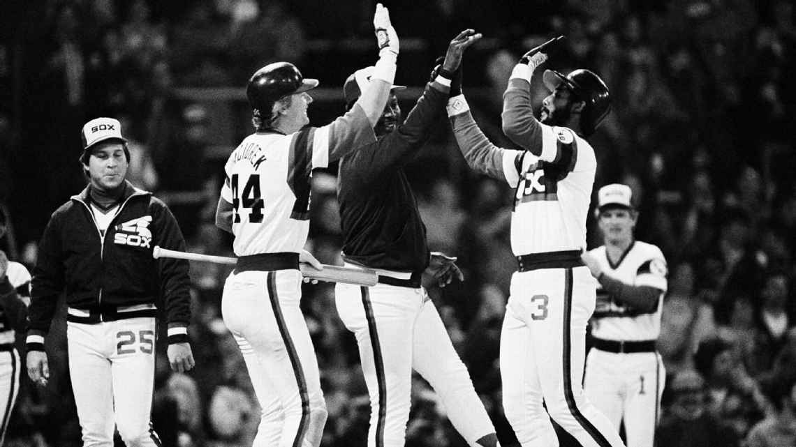 Harold Baines llega al plato luego de disparar jonrón en el fondo de la entrada 25 en victoria de White Sox sobre Brewers en 1984. AP Photo/Fred Jewell