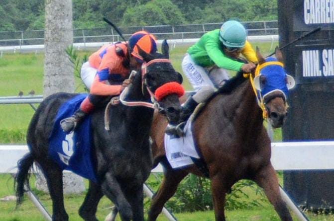 En la 1era. carrera, dominó Golden Trébol (5), del Establo Hermanos Lara. Lo condujo el jinete Carlos de León, a quien dio instrucciones el entrenador Richard Aristy. Hizo tiempo de 1:18:3/5 en los 1,300 metros. Exacta 5/6 (Golden Trébol/Never Enough). Quiniela 5/6. Trifecta 5/6/8 (completada por Wells Selected D.). Superfecta 5/6/8/4 (completada por Channeler Wells).
