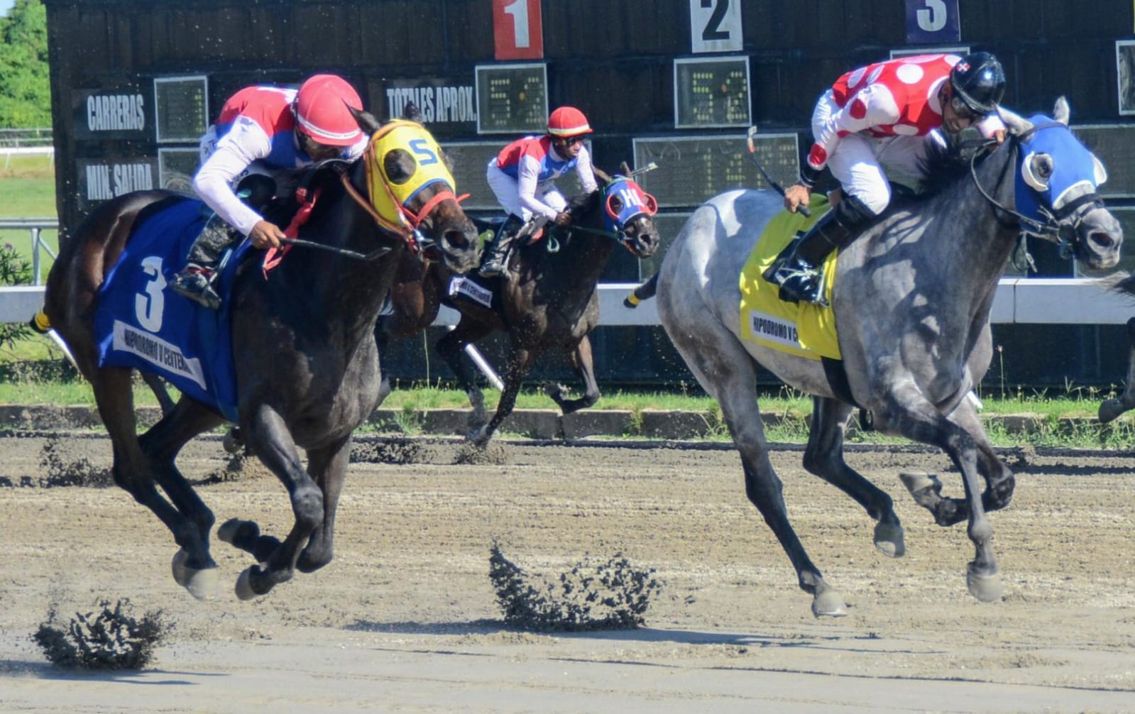 En la primera carrera, se impuso Sky´s The Limit (3),del Establo Hermanos Lara. Llevó la monta del jinete Trusman Quevedo, a quien orientó el entrenador Richard Aristy. Registró tiempo de 1:14:3/5 en los 1,200 metros. Exacta 3/4 (Sky´s The Limit/El Protector). Quiniela 3/4. Trifecta 3/4/2 (completada por Victoria de Acero). Superfecta 3/4/2/con todos.