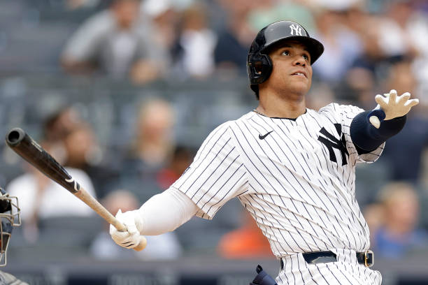 NEW YORK, NY - JULY 22: Juan Soto #22 of the New York Yankees hits a solo home run during the seventh inning against the Tampa Bay Rays at Yankee Stadium on July 22, 2024 in New York City. The Yankees won 9-1. (Photo by Adam Hunger/Getty Images)