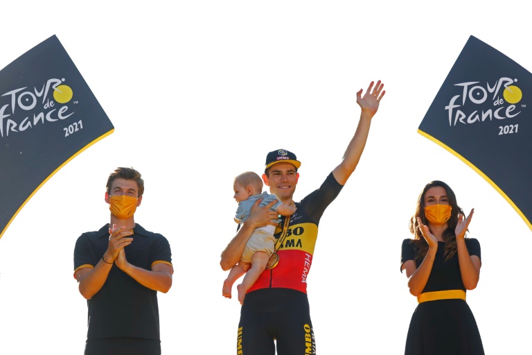 El ciclista Wout van Aert celebra con su bebé su victoria en la 21ª y última etapa del Tour de Francia el 18 de julio de 2021 en los CAmpos Elíseos, en París/ Fuente Externa