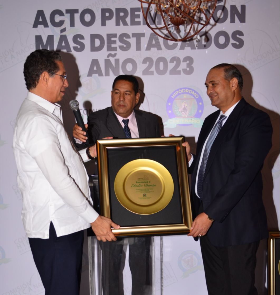 Eladio Durán, propietario de la cuadra Wells Stable, aparece junto a las 4 placas que recibió en la premiación anual que organiza la Comisión Hípica Nacional, para los entes y ejemplares más destacados de cada año, en su caso, por las actuaciones de sus ejemplares en el 2023, incluyendo a Wicke Wells JLC, elegido como Caballo del Año. Fuente Externa