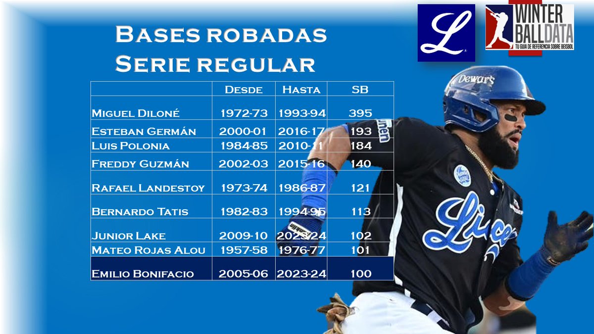 Emilio Bonifacio, del Licey, está a ley de una base robada más de Mateo Rojas Alou, quien se estafó 101 en quince temporada con el Escogido.