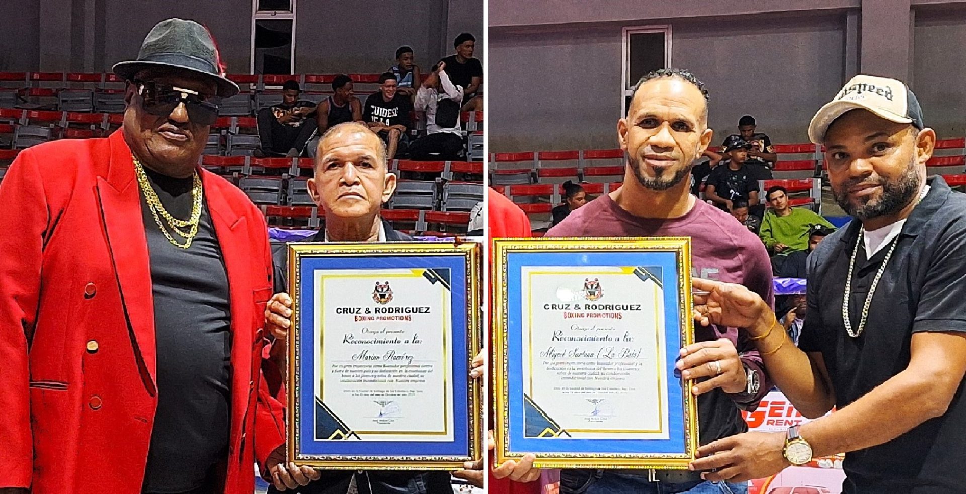 SANTIAGO .- Las empresas Cruz & Rodríguez Boxing Promotion, de José Aníbal Cruz y Golden Globe Boxing Promotion, de Everton Boland, reconocieron al ex pugilista profesional, Marino Ramírez y al técnico-entrenador, Miguel -La Bala- Santana, en una ceremonia realizada el pasado domingo en el trascurso de la cartelera de ese deporte montada por ellos en Santiago.