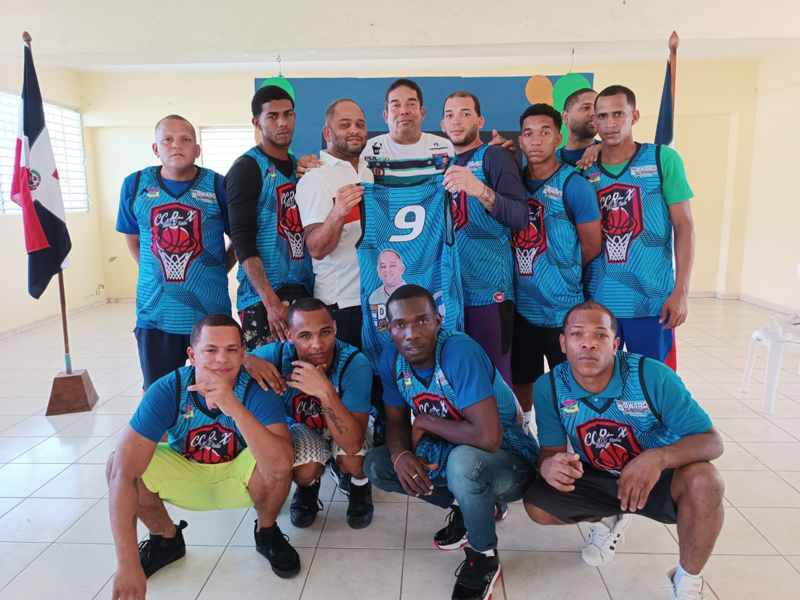 Edward Alvarado, Tony Reyes y Juan Liberato  entrega uniformes a impedidos de libertad del centro correccional de Vista al Valle que participan en el torneo interno de baloncesto. Fuente Externa