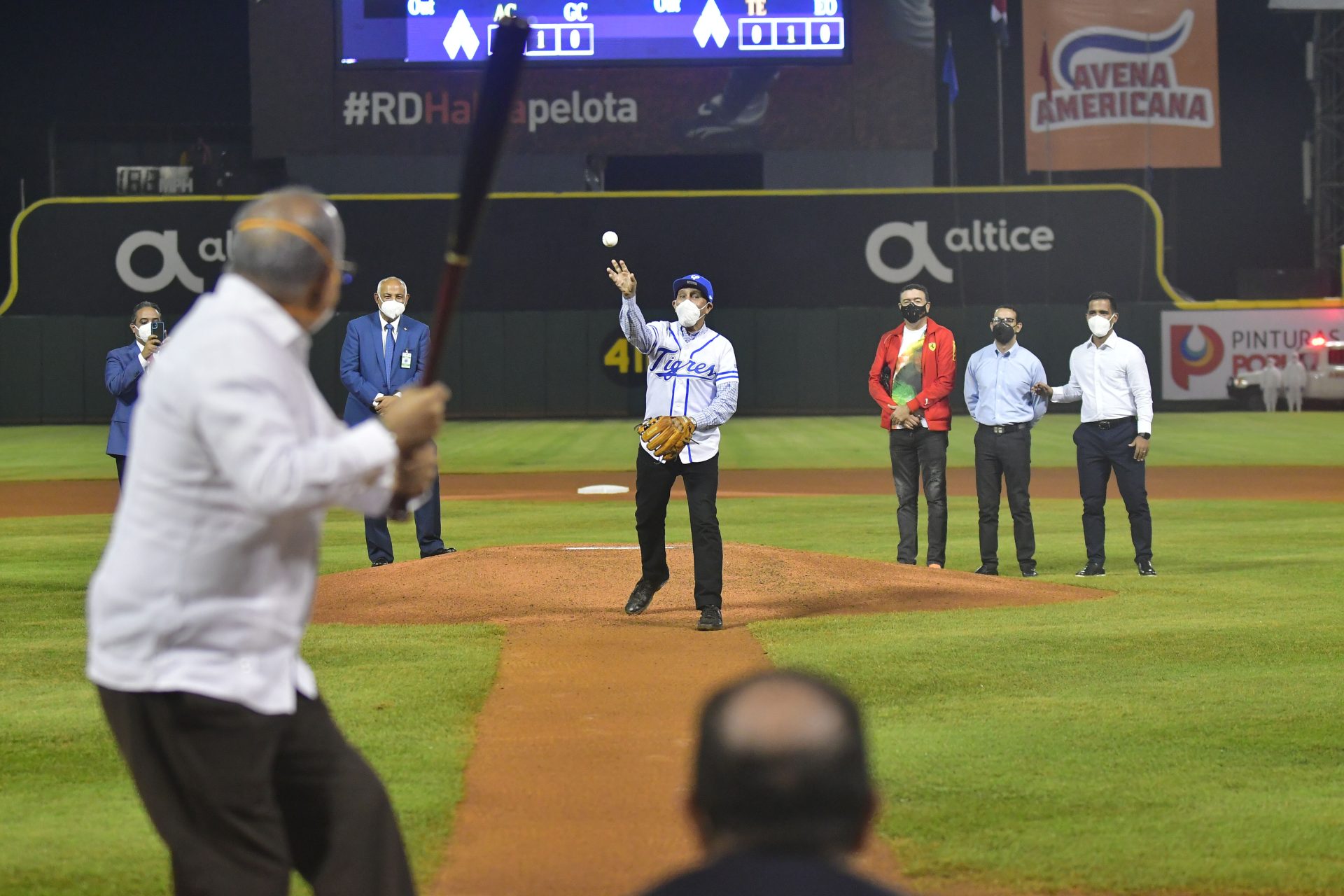 El ministro de Salud Plutarco Arias como bateador de honor y el viceministro de Deportes Franklin De la Mota de receptor en el homenaje del Licey al personal médico de todo el país que ha luchado contra la covid-19. Fuente Externa