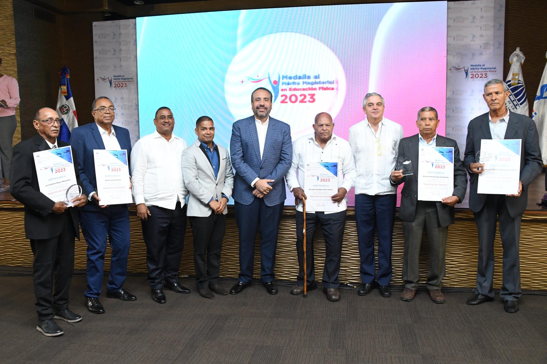 El director ejecutivo del INEFI, Alberto Rodríguez Mella, junto a los “Maestros de Siempre” Román Montilla de los Santos, José Ramón Reyes Mercedes, Rafael Cuello Reyes, Ricardo Gioriber Arias y Garibaldi Rafael Almonte Lluveres, presentes en el acto de premiación de la «Medalla al Mérito Magisterial en Educación Física» celebrado en el hotel Barceló, en el Distrito Nacional. Fuente Externa