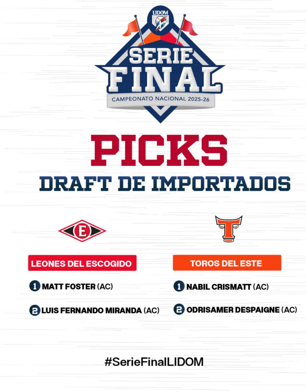 SANTO DOMINGO. Los Leones del Escogido seleccionaron este martes a los pitchers Matt Foster y Luis Fernando Miranda y los Toros del Este escogieron a los también serpentineros Nabil Crismatt y Odrisamer Despaigne durante el Draft de Importados celebrado de cara a la Serie Final del campeonato 2025-2026 dedicado a Juan Marichal.