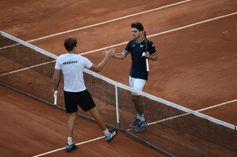 El tenista alemán Alexander Zverev (L) y el brasileño Thiago Seyboth Wild se saludan tras el encuenrtro por Copa Davis el 4 de marzo de 2022. Fuente Externa.