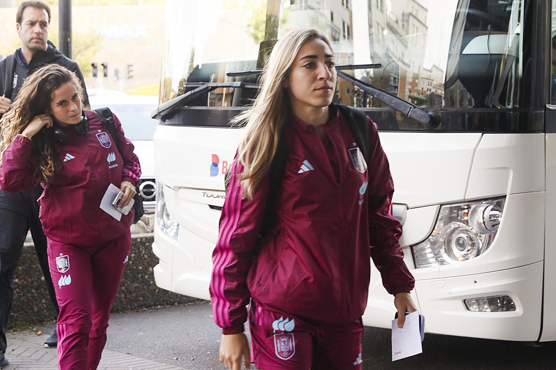 El primero en bajar del bus fue el presidente en funciones de la RFEF, Pedro Rocha, acompañado por el responsable de fútbol femenino Rafa del Amo y después la seleccionadora Montse Tomé en solitario.