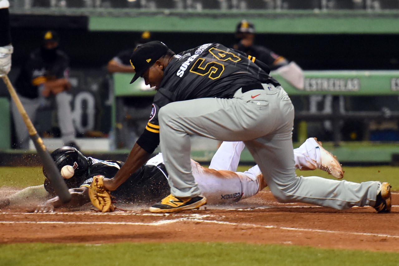 Domingo Leyba se lanza de cabeza en el home para anotar una carrera, mientras Ramón Rossó trata de impedirlo/ Fuente Externa