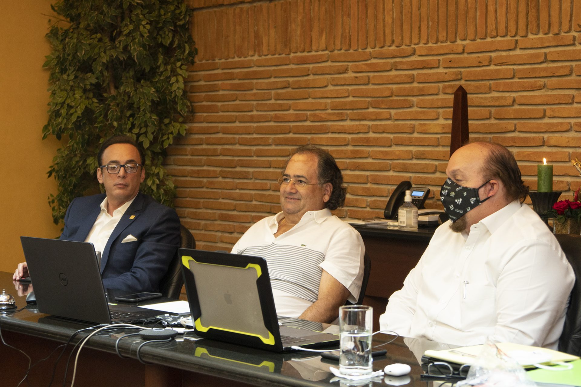 El ingeniero Miguel Feris (centro) mientras presidía la asamblea de accionistas de las Estrellas, en la cual fue reelecto como presidente del club de béisbol. Desde la izquierda, Luis Manuel Aguiló (vicepresidente de mercadeo y comunicaciones), Feris y Pável Aguiló (vicepresidente ejecutivo).