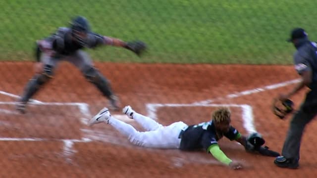 Domingo Leyba anota la primera carrera del juego luego de una llamada revertida tras la revisión en la parte baja de la 1ra entrada. Fuente Externa