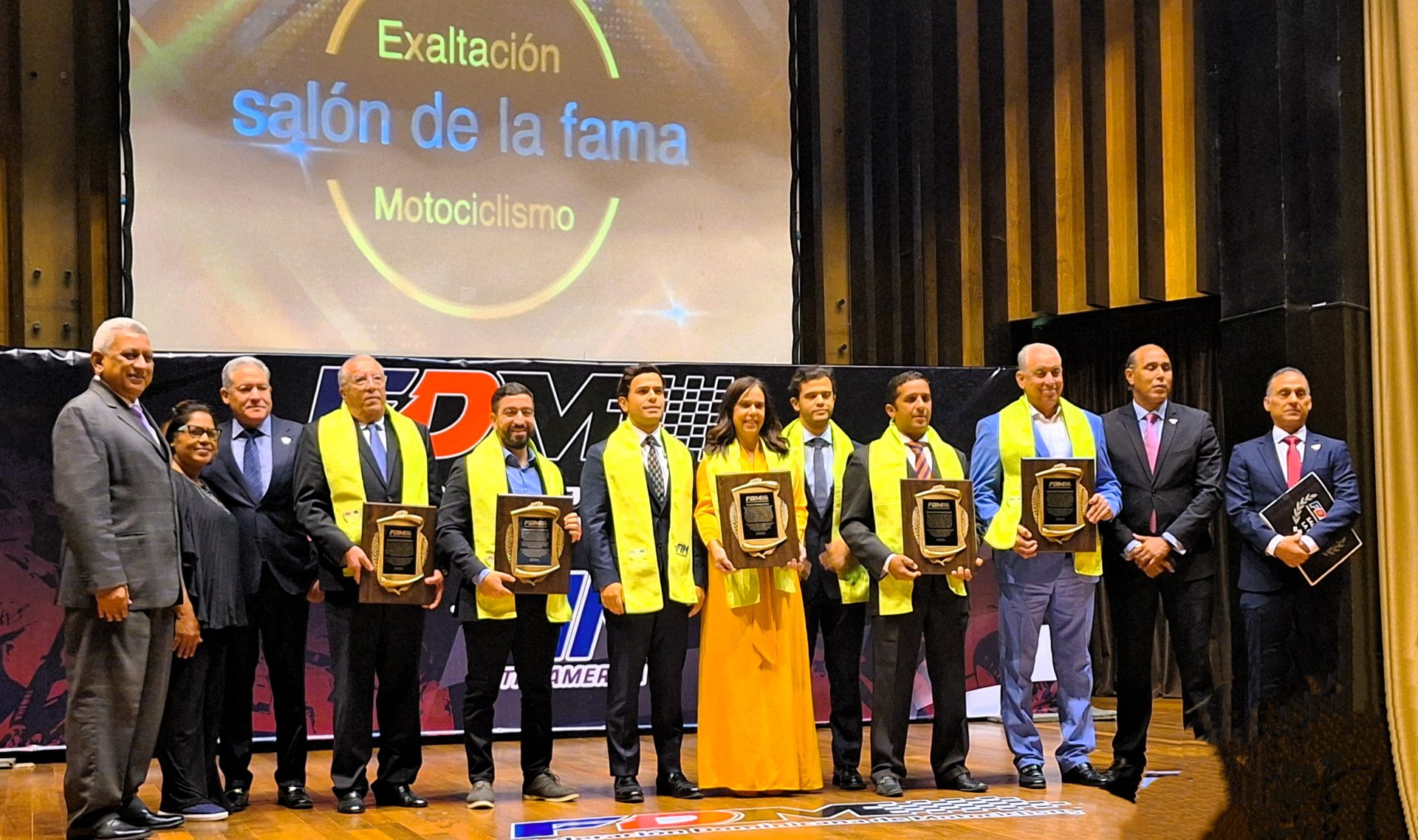 Los exaltados al Salón de la Fama del Motociclismo Dominicano, Luís -Chilo- Sánchez (Motocross), Luichy Morín (Motocross) y Emmanuel Cruceta (Enduro), junto a los familiares de los fenecidos, Jimmy Pool (Primer presidente histórico de FDM) y Juan José Bellapart (Propulsor del deporte motorizado, especialmente del motociclismo), al recibir sus premios de manos de, Carlos Amiro Finke Brugal, presidente de FDM; Pedro Venturo, director general de FIM/LA, así como los federados, Carlos Muñoz y Diego Campos. Fuente Externa