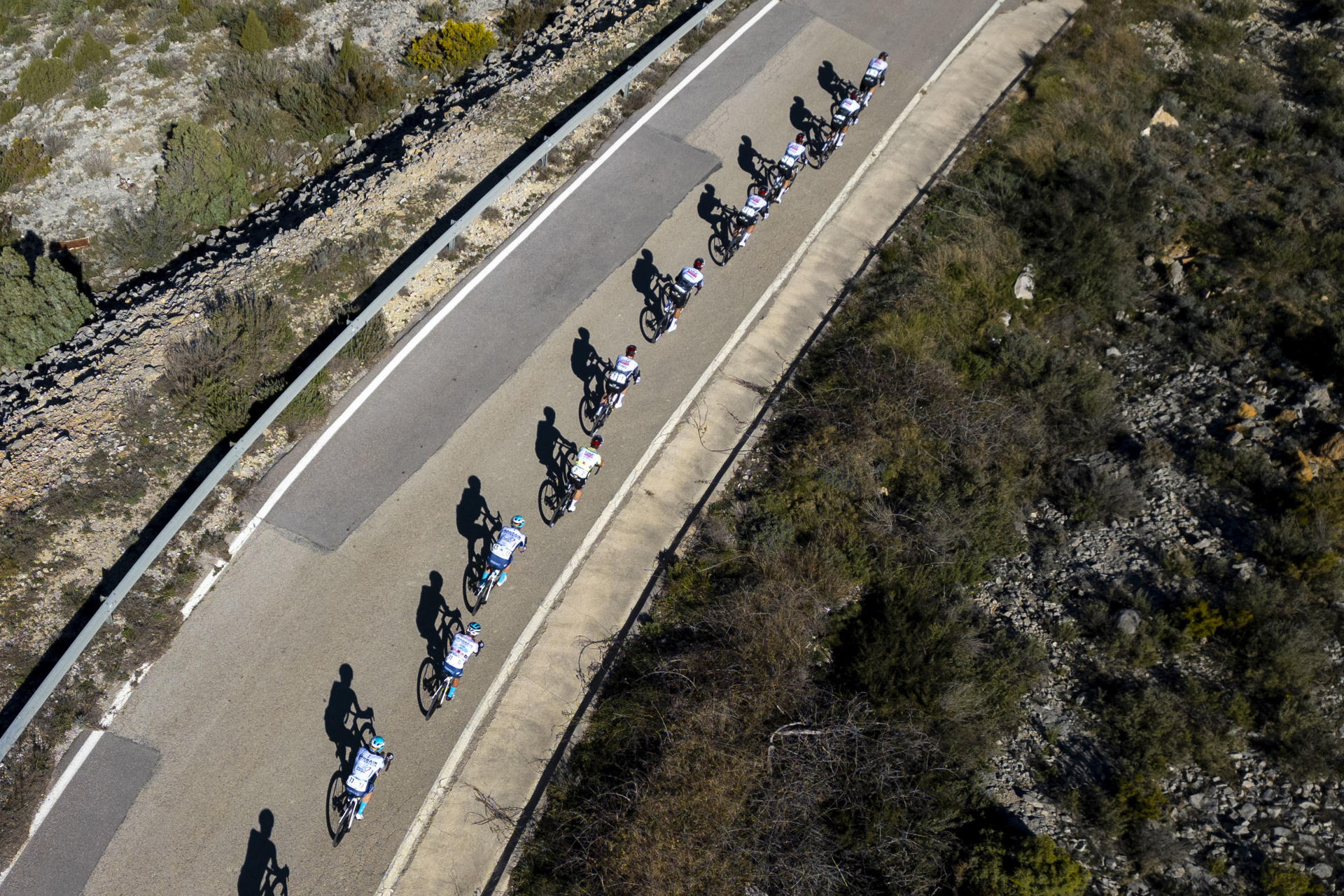 El trío superó en cabeza de carrera las ascensiones del Coll de la Bandereta y el Coll de la Basa, este último con una diferencia ligeramente superior a los 8 minutos sobre un pelotón cuyo mando tomó el equipo Movistar a 100 kilómetros de meta. La escuadra española imprimió un fuerte ritmo que provocó que comenzara a descender la ventaja de los escapados.