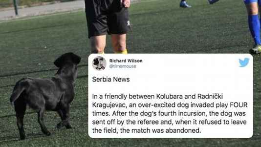 El futbol serbio se paralizó este sábado debido a un hecho singular, y es que en un juego amistoso entre el Kolubara y el Radnicki, un perro fue expulsado después de cuatro interrupciones al juego, aunque no contaron con la astucia del animal.
