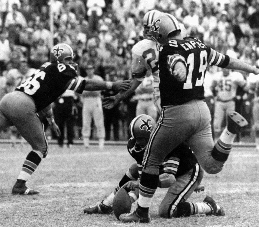 En imagen de archivo del 8 de noviembre de 1970, Tom Dempsey (19), de los Saints de Nueva Orleans, se prepara para conectar un gol de campo de 63 yardas en el duelo ante los Lions de Detroit, en Nueva Orleans. (AP Foto/archivo)