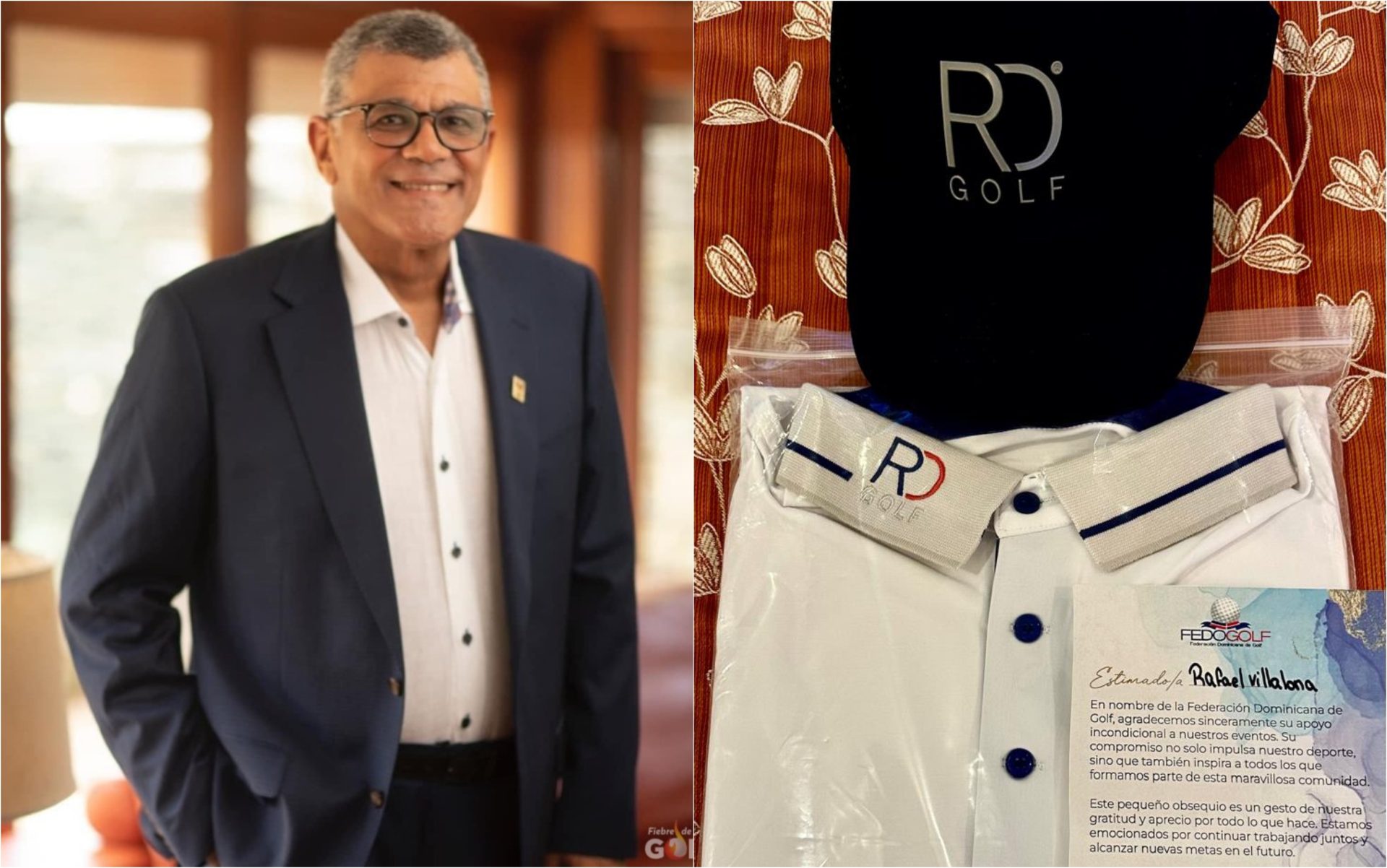 SANTO DOMINGO, R.D. – La Federación Dominicana de Golf (Fedogolf) obsequió camisetas al pasado presidente de la institución, ingeniero Rafael Villalona Calero, como souvenirs, en “agradecimiento a su apoyo incondicional a nuestros eventos”.