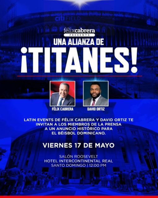 SANTO DOMINGO.- Eventos Latinos que preside el empresario dominicano radicado en Nueva York Félix Cabrera anunciará éste viernes aquí una alianza con el ex pelotero e Inmortal de Cooperstown David Ortiz.