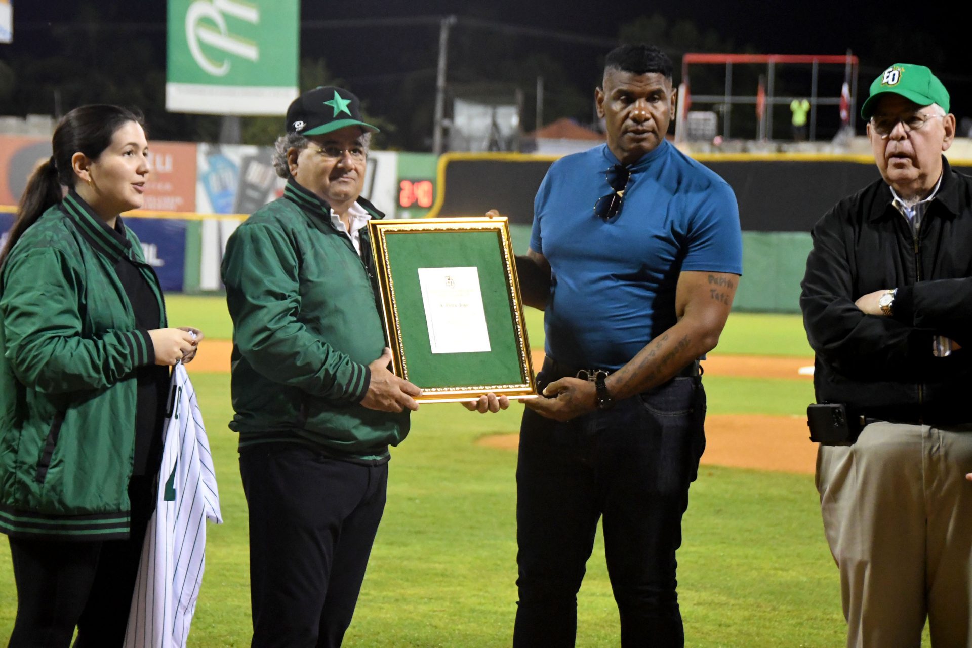 El presidente de las Estrellas, Miguel Feris, entregó una camiseta con el número 34 y el nombre del inmortal del deporte dominicano. También una placa de reconocimiento. Le acompañaron los también directivos de las Estrellas José Manuel Mallén (vicepresidente); José Mallén Calac (vicepresidente de operaciones de béisbol); Jorge Moreira (vicepresidente administrativo); y Marialina Feris de Moreira.
