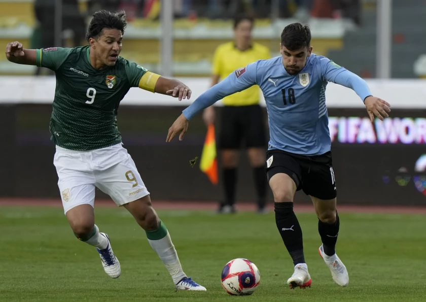 Marcelo Martins, izquierda, de Bolivia, pelea el balón con el uruguayo Mauro Arambarri durante el choque en las eliminatorias sudamericanas para la Copa del Mundo, en el estadio Hernando Siles de La Paz, Bolivia, el martes 16 de noviembre de 2021. (ASSOCIATED PRESS)