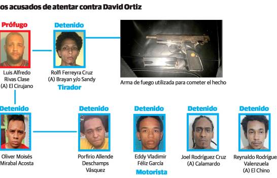 Los acusados son: Víctor Hugo Gómez Vásquez o Jesús Manuel Ortiz, Junior Julio César La Hoz Vargas (“Yayo o El Lindo”), Alberto Miguel Rodríguez Mota, Carlos Rafael Álvarez Pérez (Carlos Nike), José Eduardo Ciprián Lebrón (“Chuky”), Gabriel Alexander Pérez Vizcaíno (“Hueso” o “Johan”), Franklin Junio Merán (“Rubirosa”), Oliver Moisés Mirabal (“El Papi”), Joel Rodríguez de la Cruz (“Calamardo”), Reynaldo Rodríguez Valenzuela (“El Chino”), Eddy Vladimir Feliz García (“Vlady” o “El Nata”), Rolfi Ferreira Cruz (“Sandy” o “Brayan”) y Porfirio Allende Dechamps Vásquez (“Nene”).
