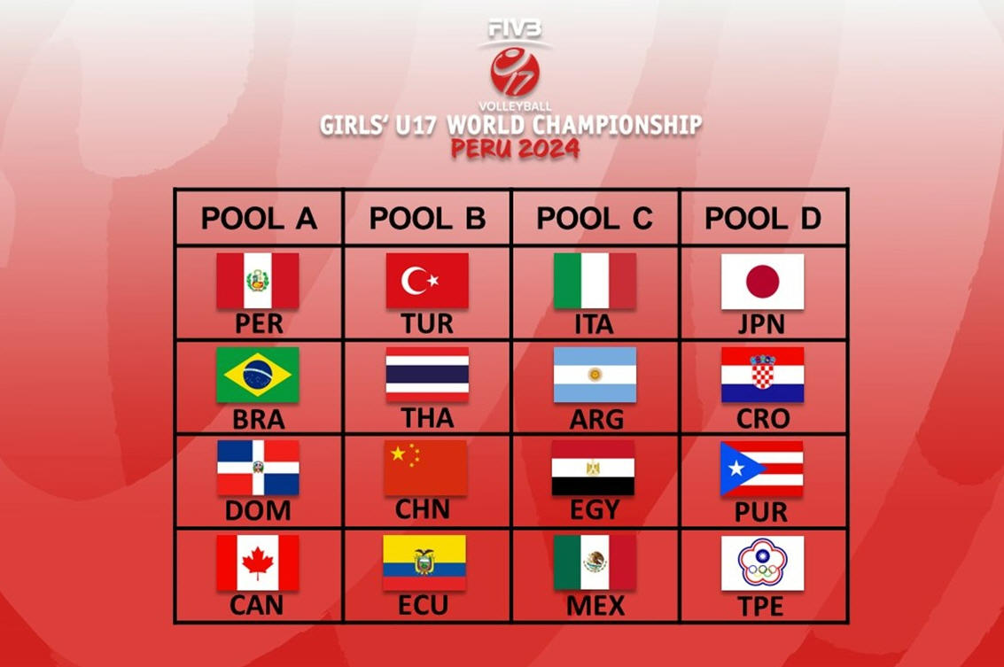 Los anfitriones Perú estarán en el Grupo A, donde enfrentarán a sus rivales continentales Brasil, República Dominicana y Canadá. El Grupo B contará con Turquía, Tailandia, China y Ecuador.