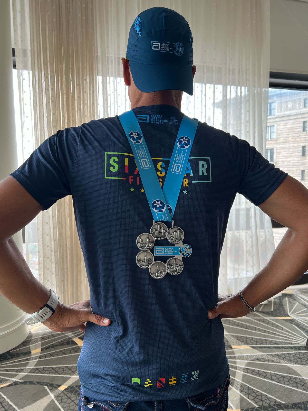 Colgando de su cuello estaban las medallas de los 6 marathones que corrió y en el centro la medalla única de los 6 Majors.