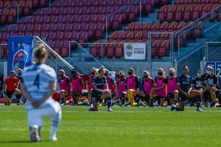 Los jugadoras se alinearon en la línea media del campo y todas se arrodillaron durante el himno nacional antes del juego, que marcó el inicio de este deporte tras la suspensión de más de tres meses por la pandemia del coronavirus.