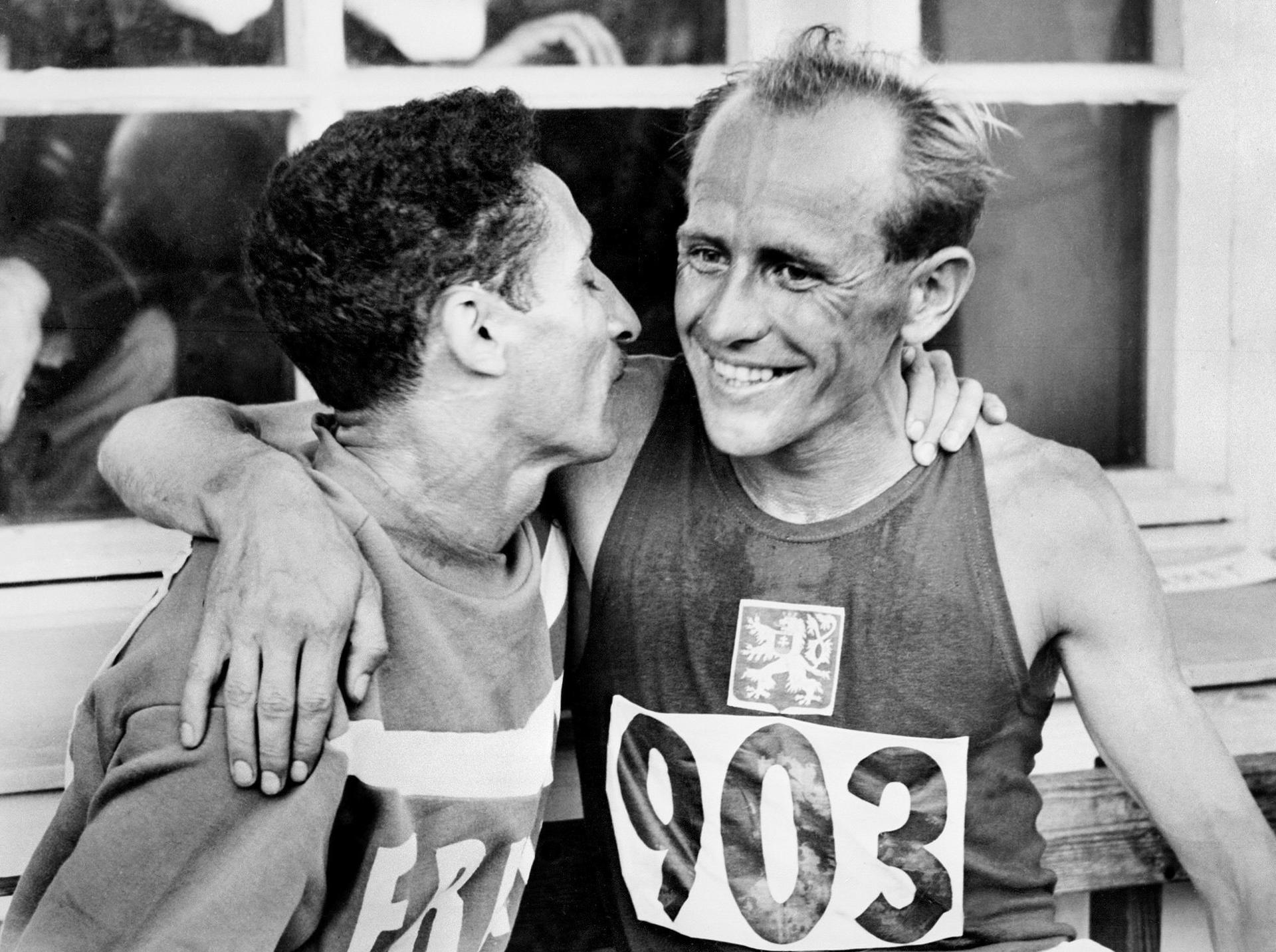 El atleta checo Emil Zatopek (d) es felicitado por el francés Alain Mimoun, tras conquistar la medalla de oro olímpica en la prueba de 5000 m de los Juegos de Helsinki, en 1952. EPA/AFP PHOTO FILES