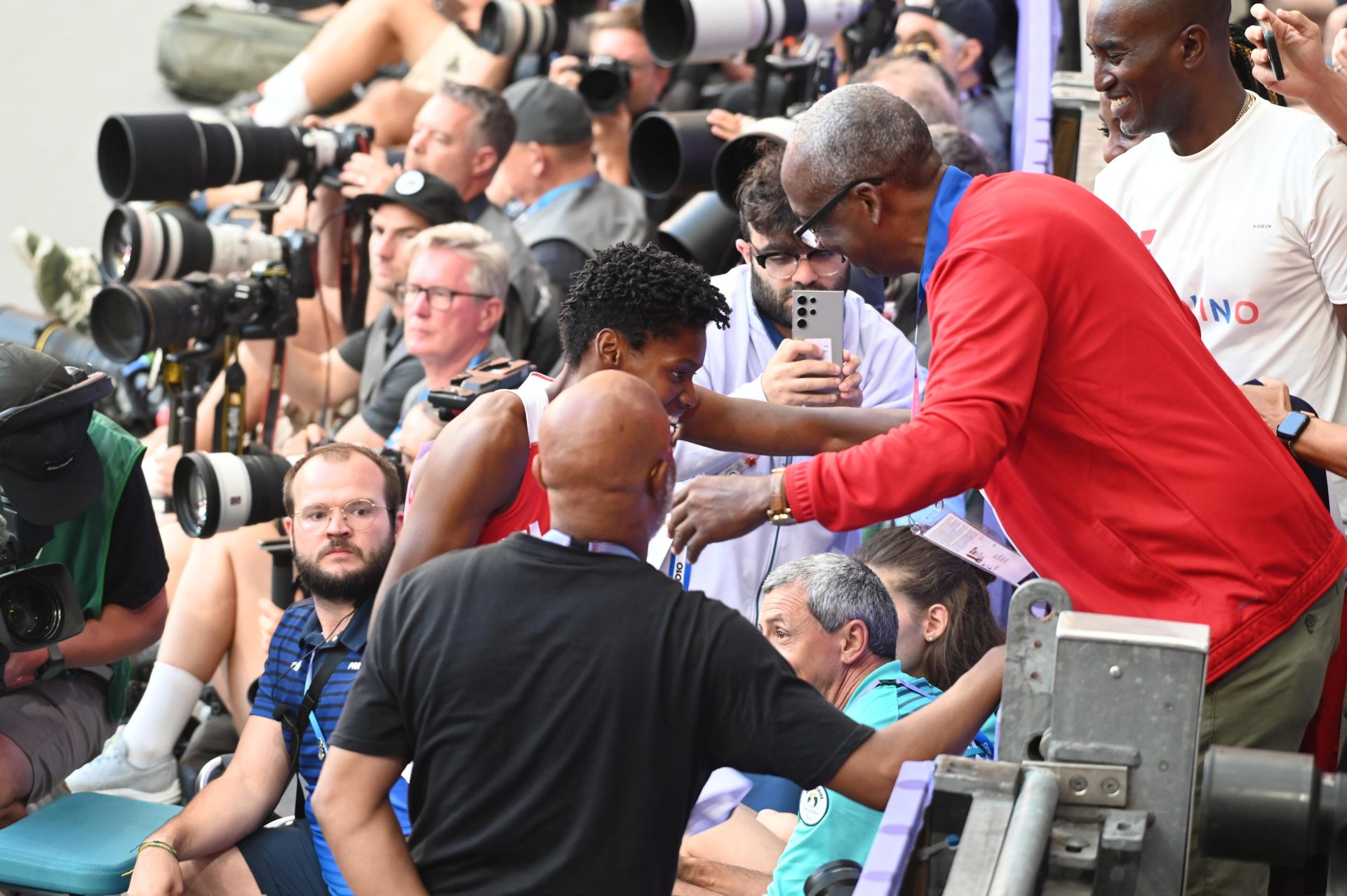 Cuando concluyó este viernes la carrera de Marileidy, èsta fue al asiento donde se encontraba Suero Correa presenciando el evento en las graderías.
