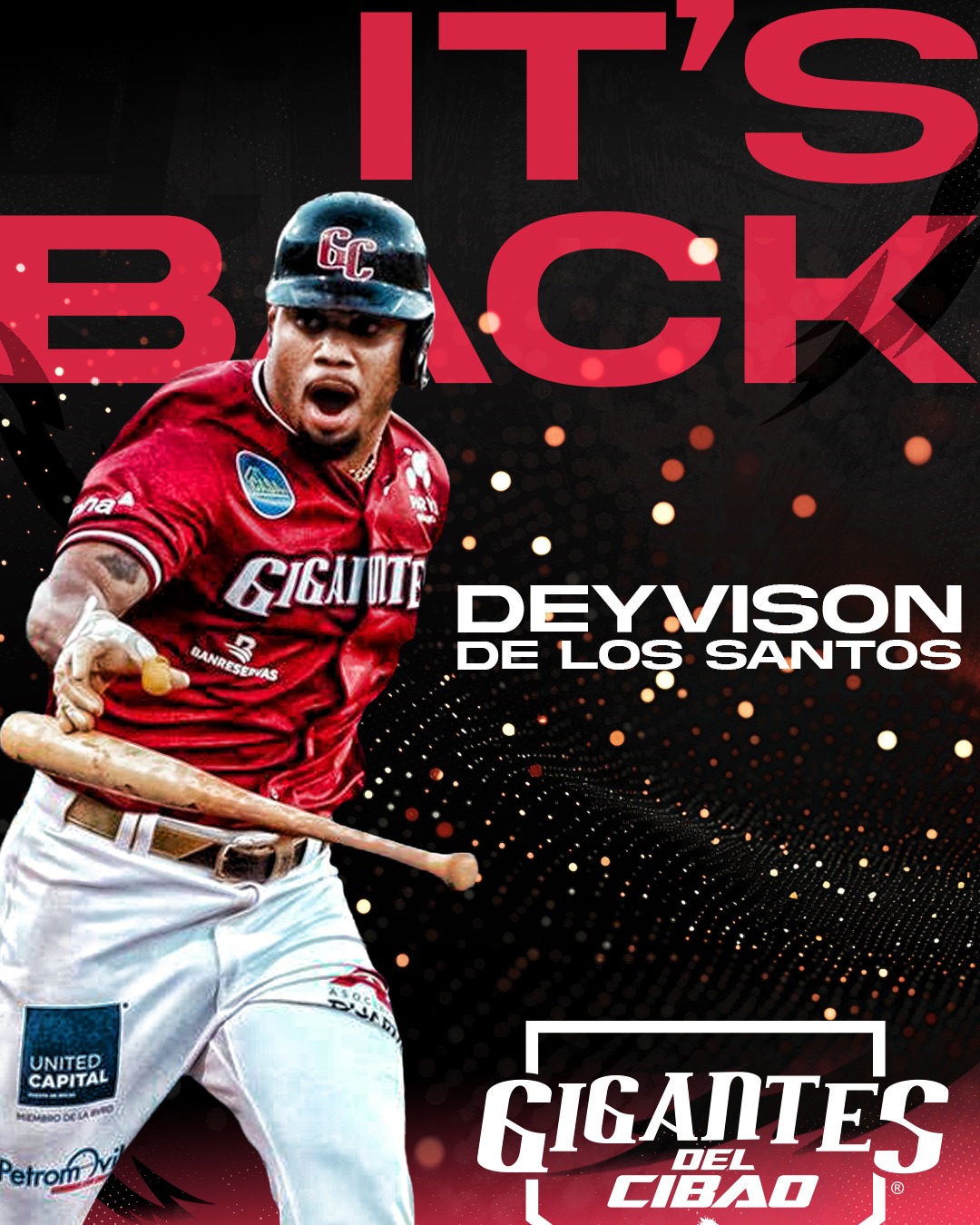 San Francisco de Macorís. – Los Gigantes del Cibao anunciaron el regreso al conjunto del jugador Deyvison De los Santos, quien se reincorporará al equipo a partir de este miércoles, cuando los Gigantes enfrenten a los Leones del Escogido en el estadio Julián Javier, en la continuación del Todos contra Todos de la Liga Dominicana de Béisbol Profesional (LIDOM).