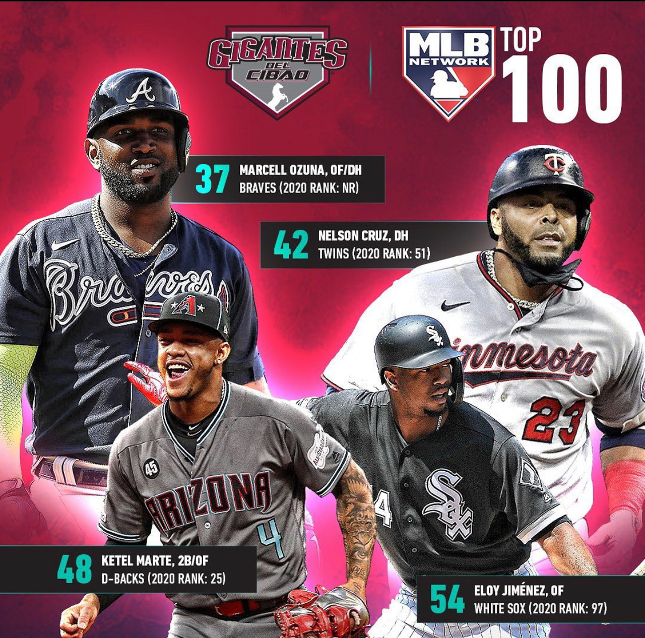 La lista la encabezan jugadores como Marcell Ozuna y Nelson Cruz, dos de los más poderosos jugadores de las grandes ligas, así también el caso de Eloy Jiménez y Ketel Marte quienes se encuentran en el ranking de los mejores 100 peloteros de la MLB para el 2021.