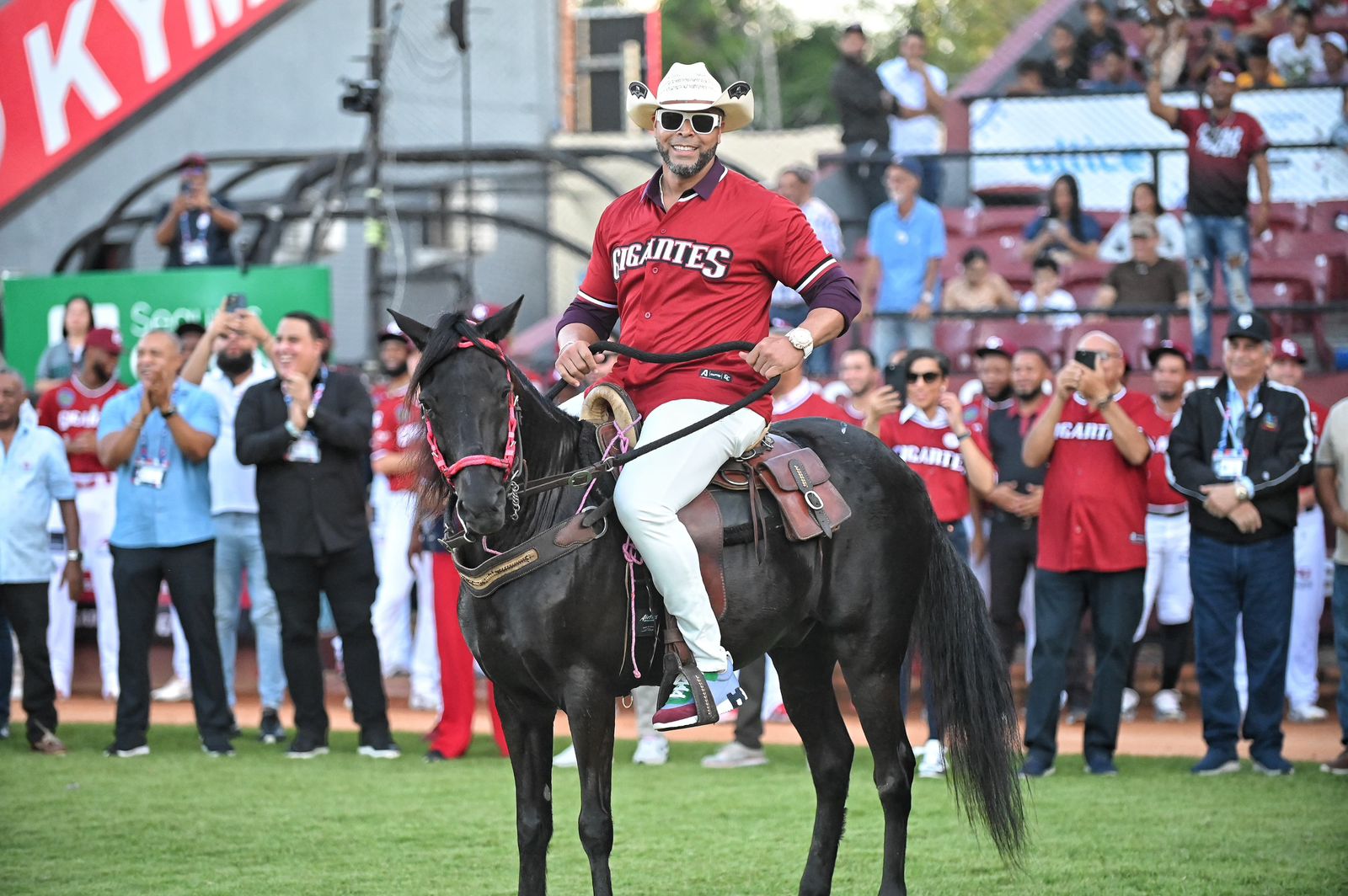 SAN FRANCISCO DE MACORIS . -Nelson Cruz entró galopando a caballo junto a Moisés Sierra y Joel Peralta al terreno del Estadio Julián Javier en la ceremonia de retiró de su camiseta número 18 en la organización de Gigantes del Cibao.