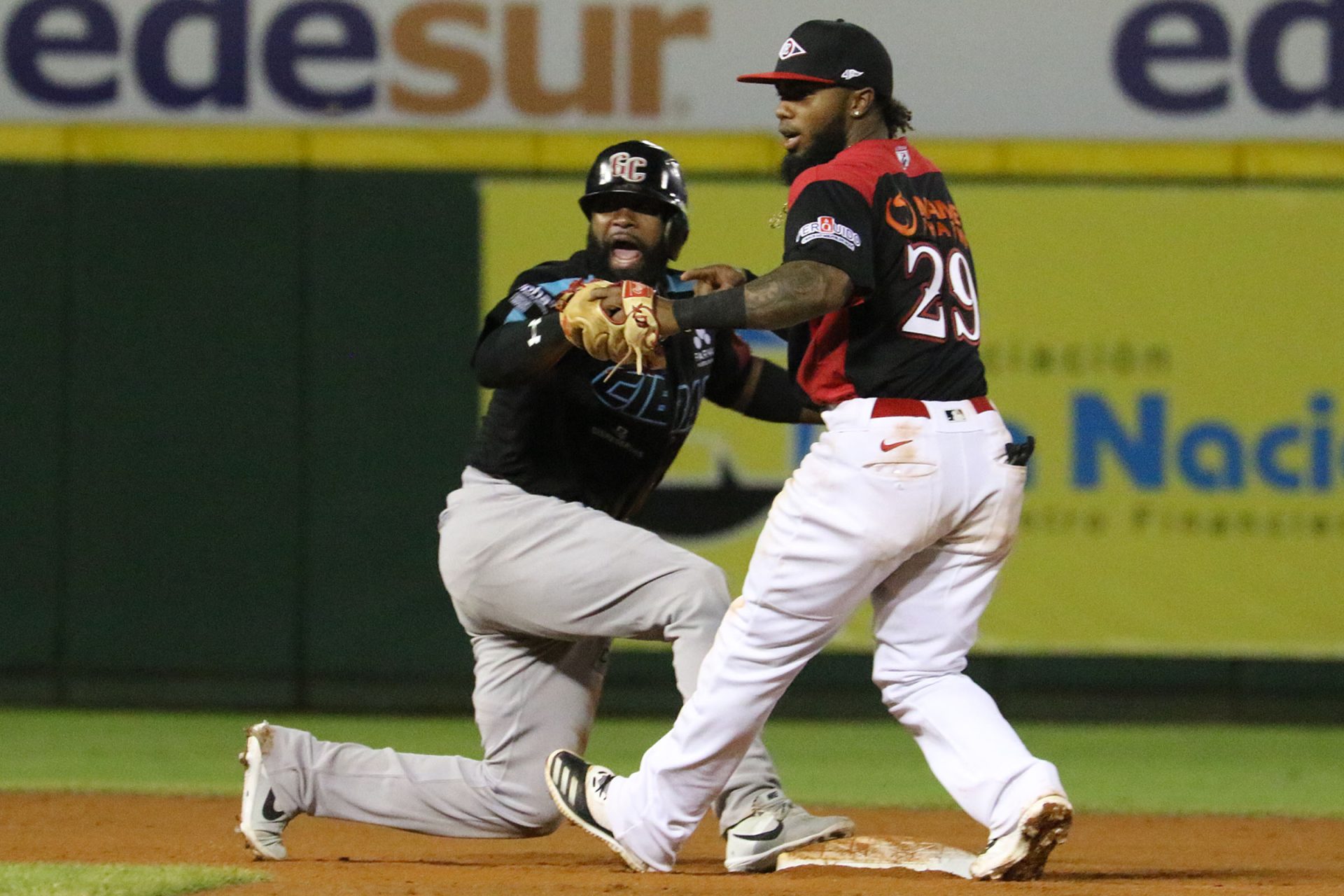 Carlos Paulino pide revisión de jugada, luego de ser puesto out en segunda base por Luis Rengifo/ Fuente Externa