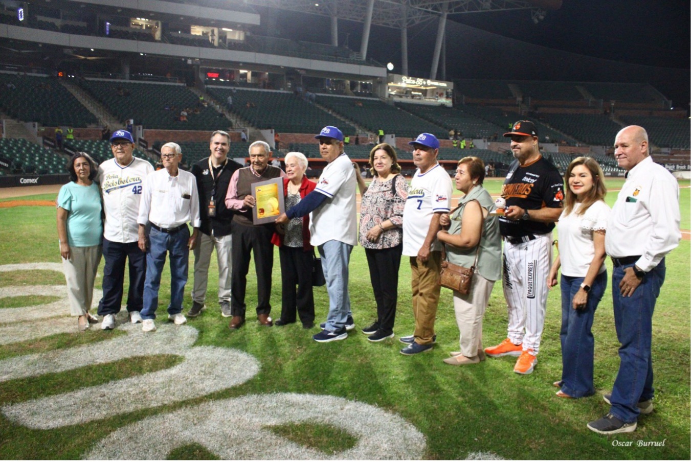 El Profr. Héctor Barrios Fernández, líder de las Peña Beisbolera de Ensenada, junto con el Ing. Pablo de la Peña Blanco, presidente interino del Club Naranjeros y Lic. Christian Veliz Valencia, director deportivo de la LMP y Juan Gabriel Castro y Cornelio García, mánager y coach de la franquicia Naranja, encabezaron en emotivo acto a nivel terreno en medio del júbilo general y aplausos de todos los presentes en tan memorable noche.