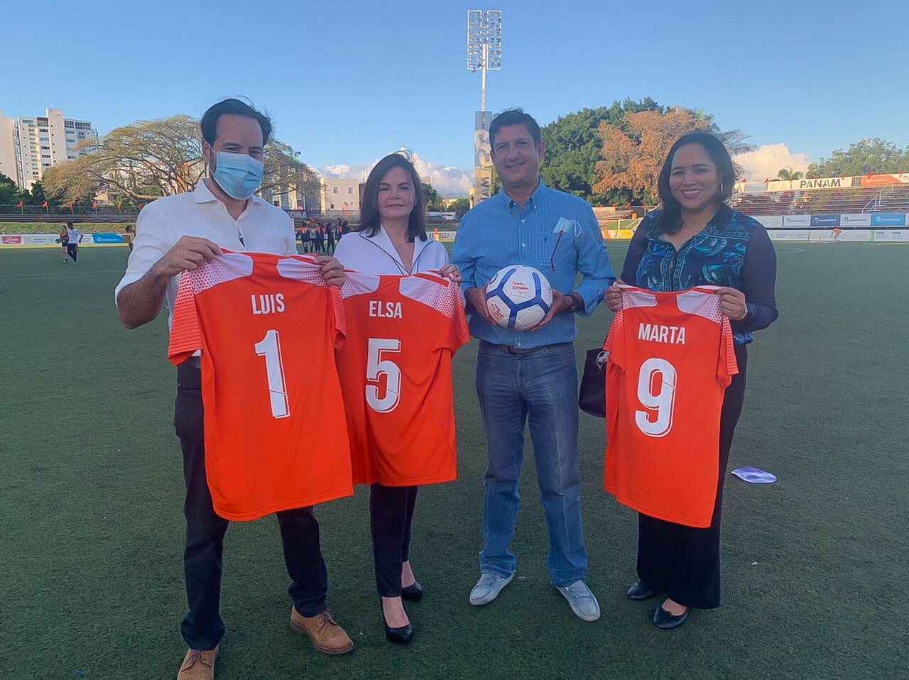El ingeniero Manuel Estrella entrega camiseta del Cibao FC a Elsa Brache, Luis Brache y Martha Martínez. Fuente Externa