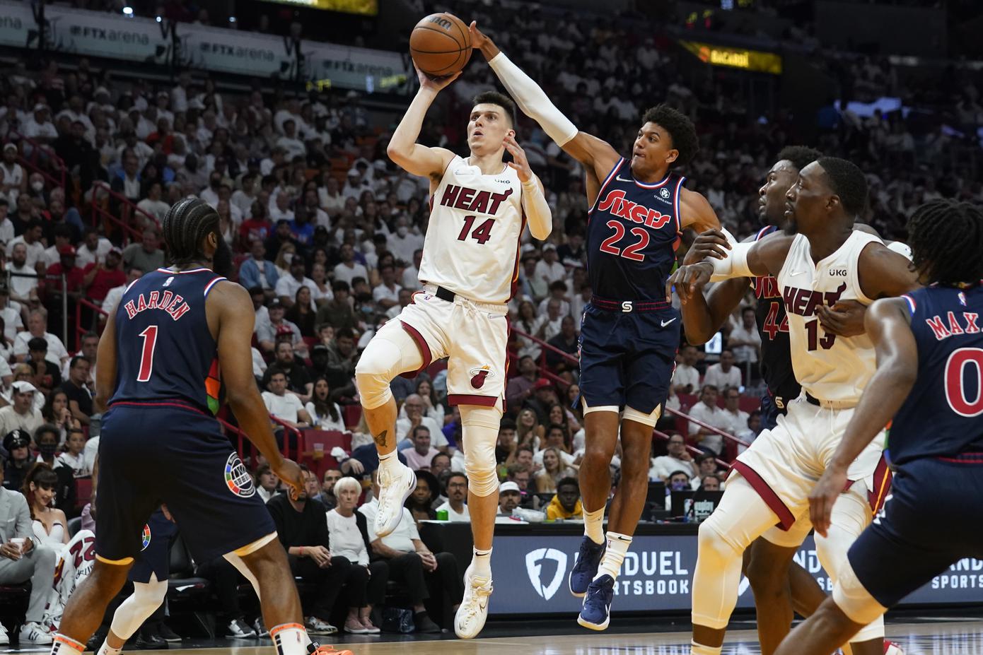 Tyler Herro se eleva para un intento al canasto ante la defensa de Matisse Thybulle. (Marta Lavandier)