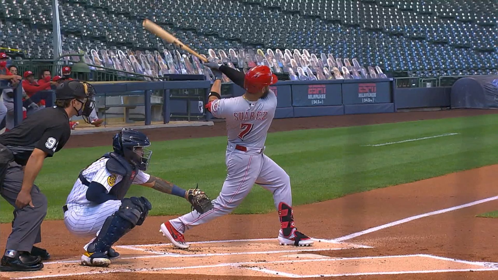 Suárez puso a los Rojos arriba 3-0 en la primera entrada con su segundo cuadrangular de la campaña. Los Rojos consiguieron una anotación en la séptima entrada y Milwaukee respondió con un elevado de sacrificio de Brock Holt en la octava.