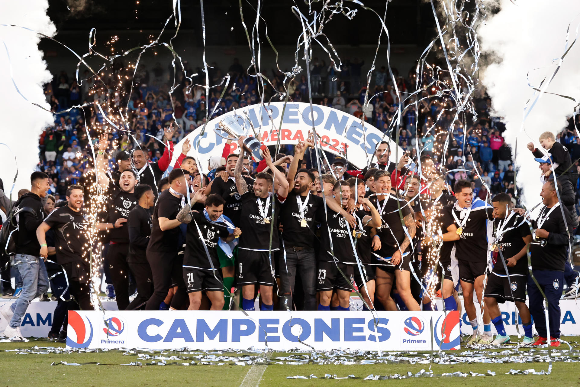 Los jugadores de Huachipato celebran tras lograr el título de la liga chilena luego de vencer a Audax Italiano, hoy, en el Estadio CAP, en Talcahuano (Chile). EFE/ Esteban Paredes Drake