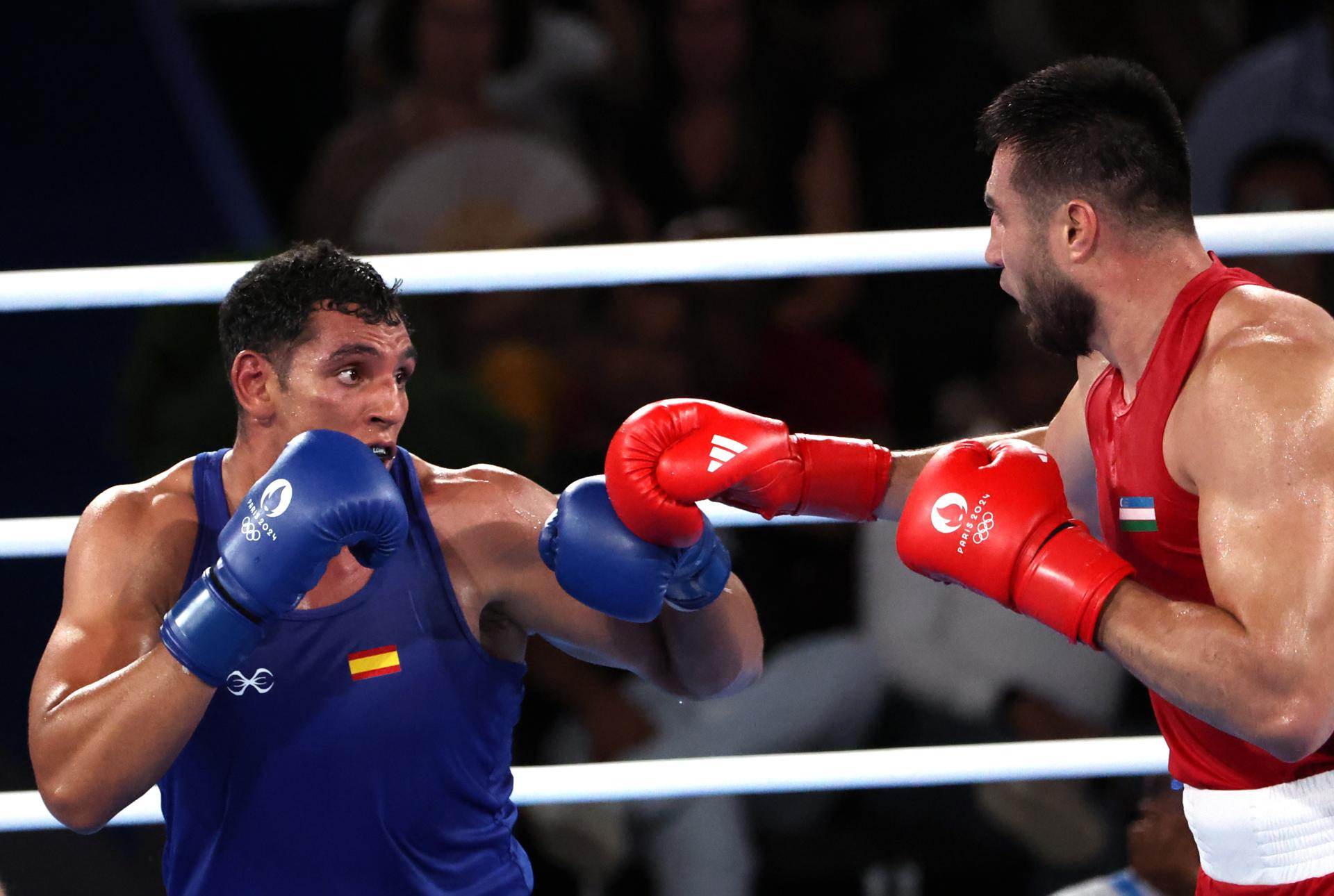 Combate de boxeo olímpico, en París 2024, entre el uzbeko Bakhodir Jalolov of Uzbekistan (rojo) y el español Ayoub Ghadfa Drissi El Aissaoui (azul), en una foto de archivo. EFE/EPA/YAHYA ARHAB