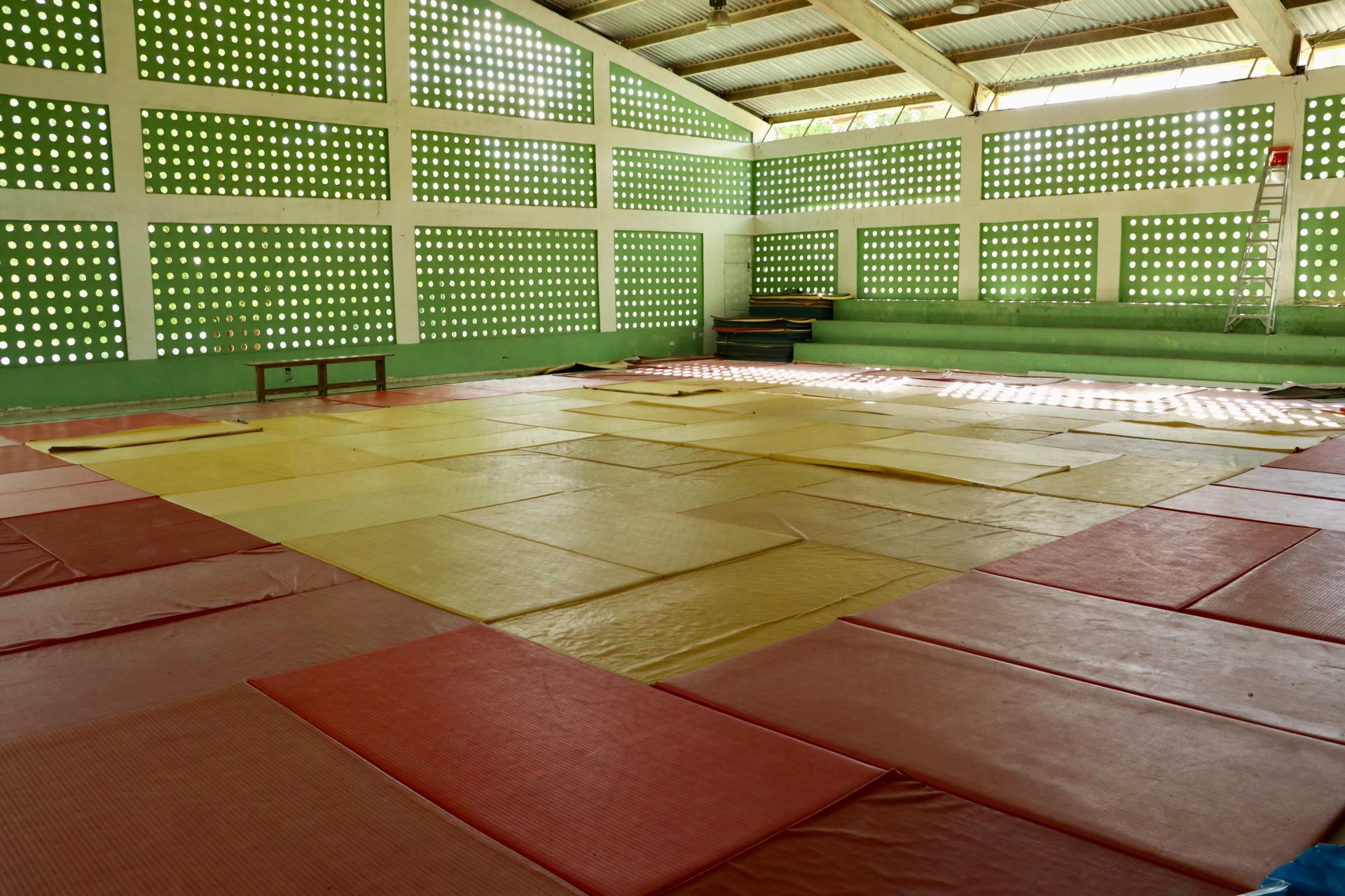 Trabajadores del INEFI colocan un tablero en una de las canchas de San Juan de la Maguana, subsede de los X Juegos Escolares Deportivos Nacionales Barahona 2023. Fuente Externa