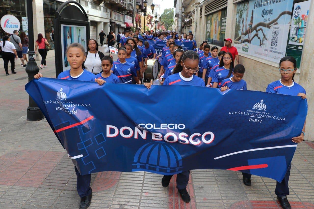 Estudiantes del colegio Don Bosco mientras se desplazaban por la calle El Conde, de la Ciudad Colonial, durante la Marcha Patriótica organizada por el INEFI en el 2023. Fuente Externa
