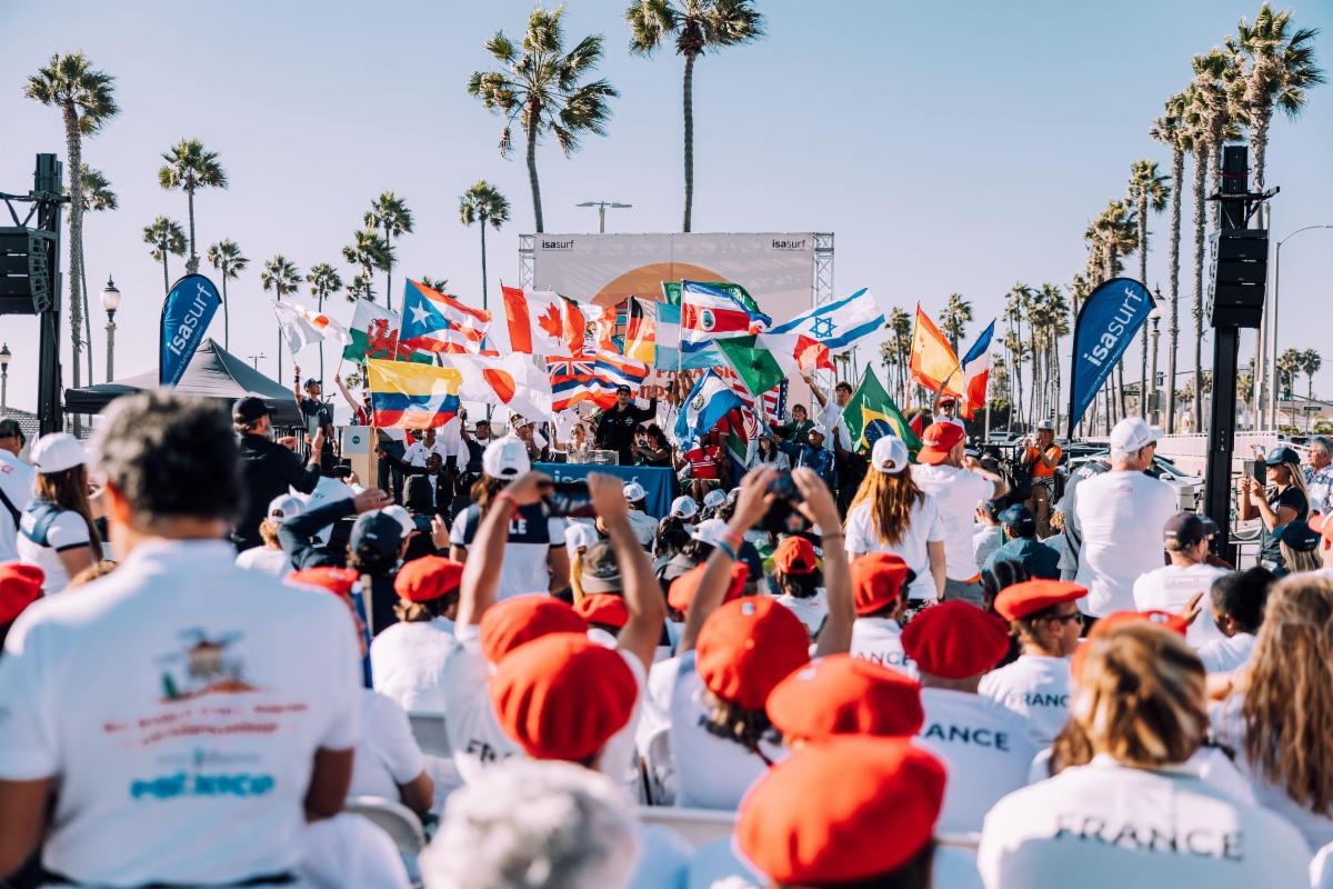 La multitud luego se reunió en Pier Plaza para la ceremonia de la ISA, “Sands of the World.” Un miembro de cada equipo nacional vertió arena de su playa local en un solo recipiente, un símbolo de la unión pacífica de las naciones del mundo a través del surf.