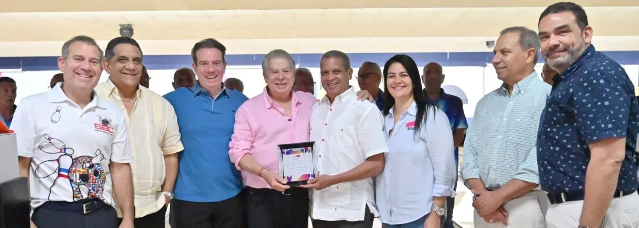 Leo Corporán recibe una placa de reconocimiento de manos de Rolando Sebelén, en presencia de Rolando Antonio Sebelén, Luis Chanlatte, Rolly Sebelén, Yamile Fatule, Garibaldy Bautista y Francis Soto, en el inicio de la versión 17 del Torneo Internacional de Boliche Sebelén. Fuente Externa