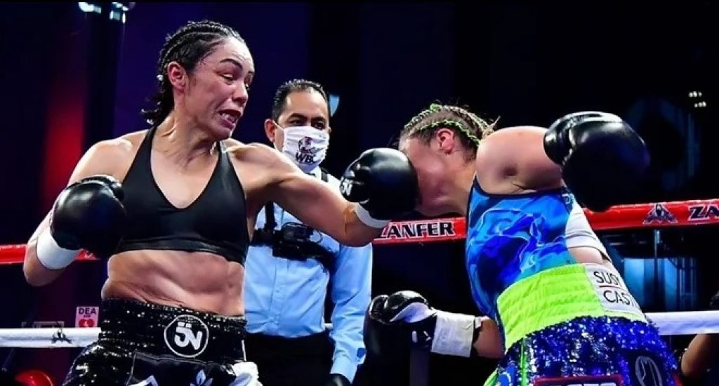El primer asalto del pleito en la división supergallo fue de estudio, pero en él la “princesa Azteca”, que llevaba más de un año sin subir al cuadrilátero, comenzó a tomar ventaja con buenas combinaciones.