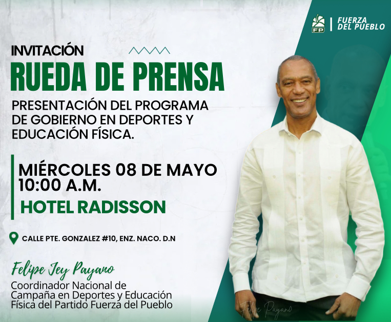 Según un breve comunicado en un flayer, la Secretaría de Deportes del Partido Fuerza del Pueblo está invitando a una importante conferencia de prensa el próximo miércoles a las 10:00 de la mañana, en las instalaciones del Hotel Radisson, en la avenida Tiradentes, en el Sector de Naco.